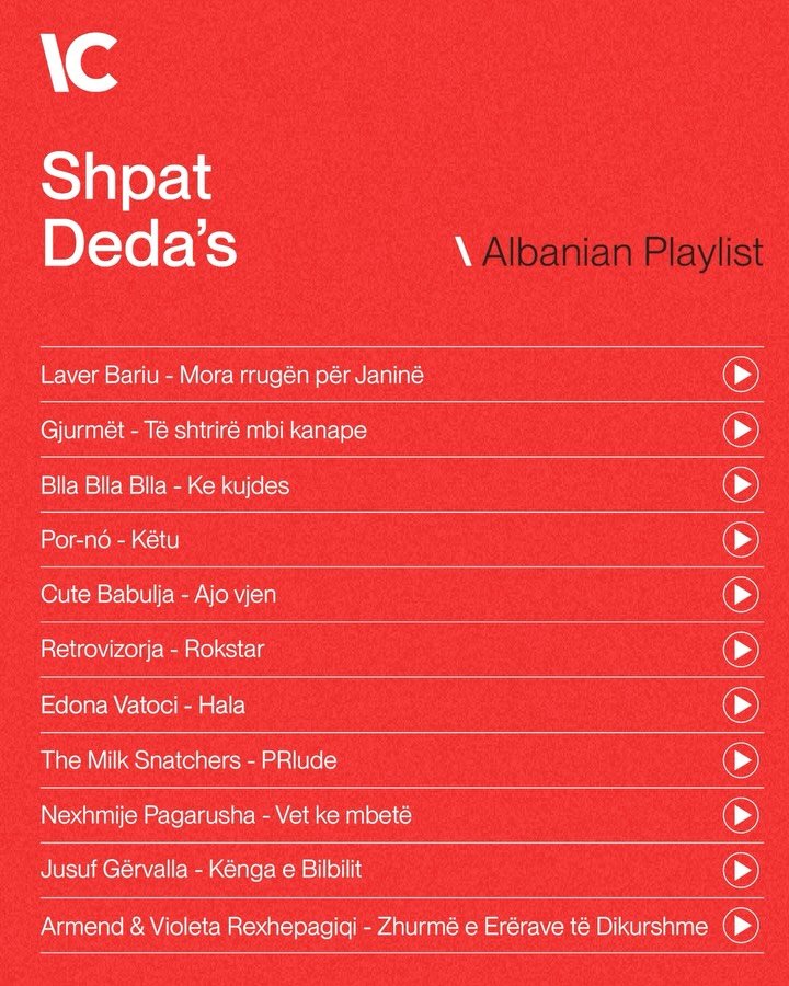 Shpat Deda’s Albanian Playlist reflects the inspirations and musical taste of one of the most beloved voices in the Albanian music scene. From timeless classics like Nexhmije Pagarusha and Laver Bariu to new waves like Por-nó and The Milk Snatchers, this playlist is a journey through Albanian emotions across styles and generations.