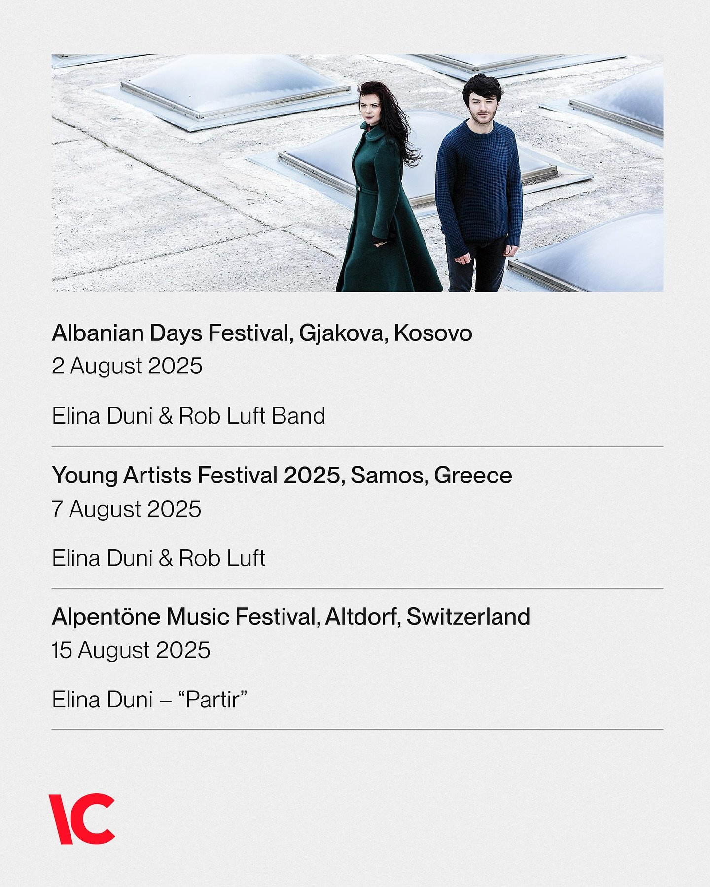 From London to Gjakova, from the Swiss alps to Greek islands. Elina Duni’s voice will travel across some of Europe’s most beautiful stages this summer. A repertoire that speaks to the soul, blending traditional Albanian roots with contemporary jazz. This is your chance to experience one of the most distinctive jazz voices live.