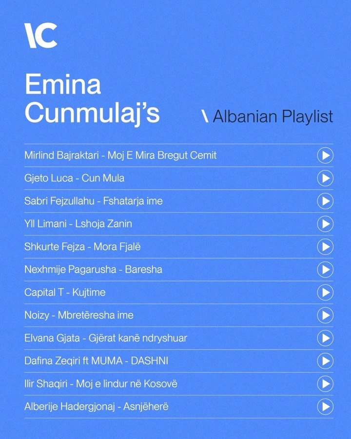 Supermodelja dhe filantropja Emina Cunmulaj, e njohur për sukseset e saj në pasarela ndërkombëtare dhe angazhimin në çështje humanitare, ndan me ne këngët që e lidhin me rrënjët e saj. Nga baladat nostalgjike të Sabri Fejzullahut, te ritmet moderne të Elvana Gjatës dhe Noizyt, ky playlist është një udhëtim përmes tingujve që formojnë peizazhin muzikor shqiptar në sytë dhe veshët e Eminës.